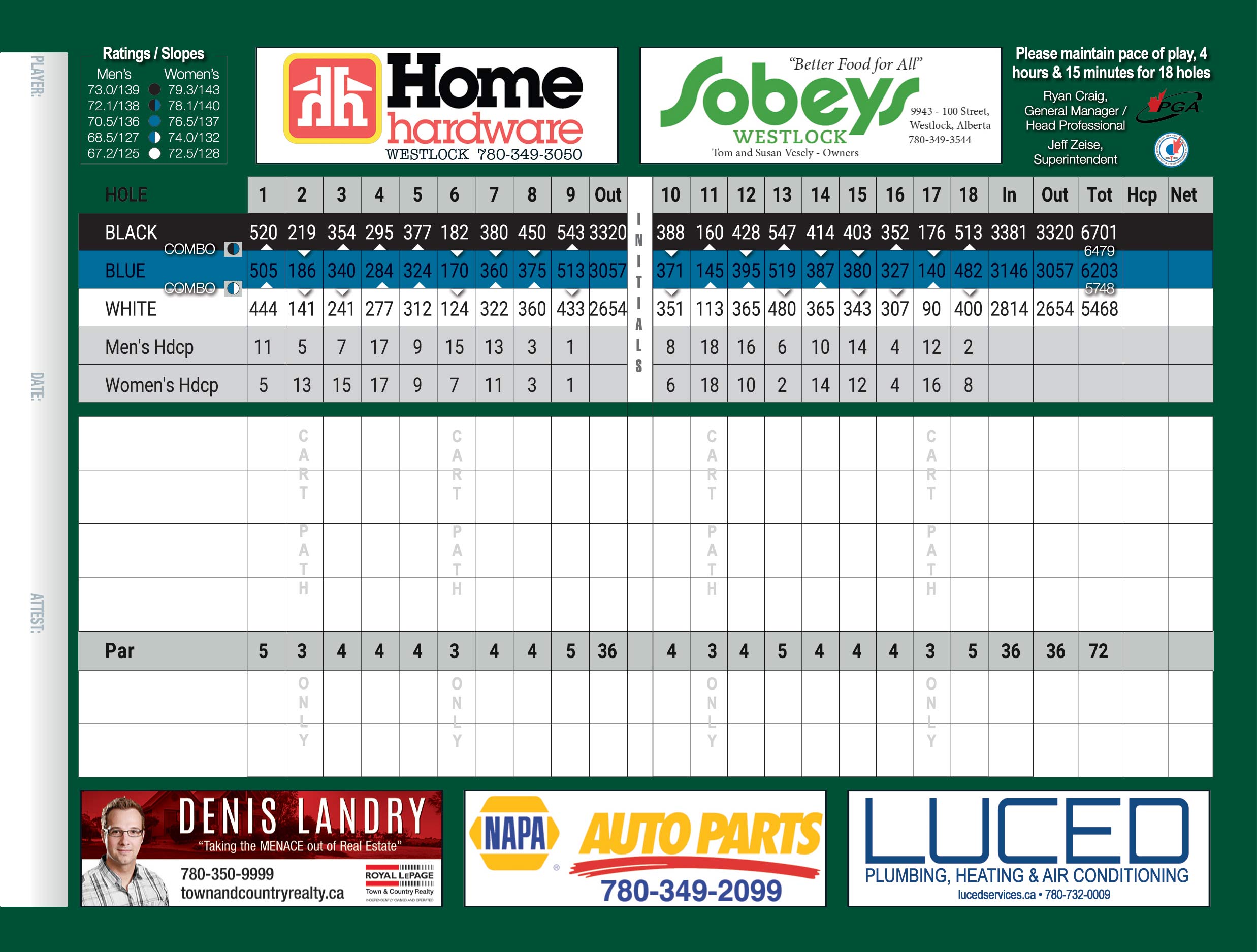 The Westlock Golf Club is an 18-hole championship golf course like no other. We offer the challenge of a traditional style back nine with tighter fairways and smaller greens. The front nine presents the opportunity to swing the driver more often, with large undulating greens and wider fairways, but with water being present on 8 of the 9 holes. The Wabash creek winds its way throughout the course, coming into play on 9 of the 18 holes.